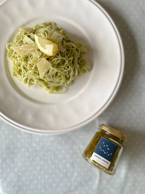 コマツナとたっぷりのナッツで作ったジェノベーゼソース。