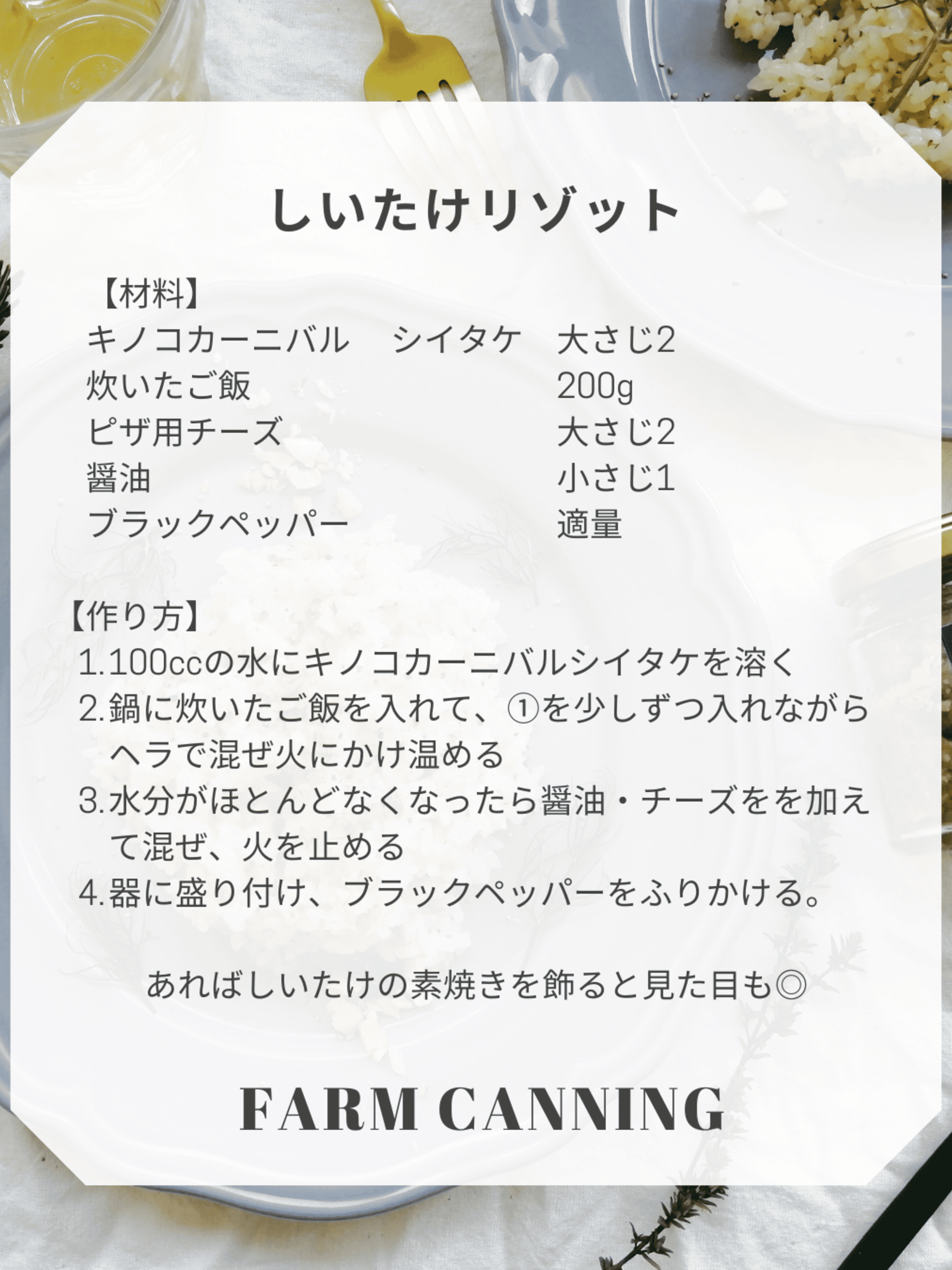 しいたけ(神奈川)、玉葱、にんにく、塩、米油、レモン汁